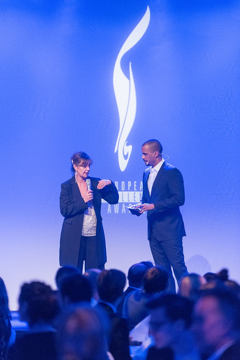 Zwei Personen auf einer Bühne bei den European Excellence Awards 2015, mit einem beleuchteten Logo im Hintergrund.