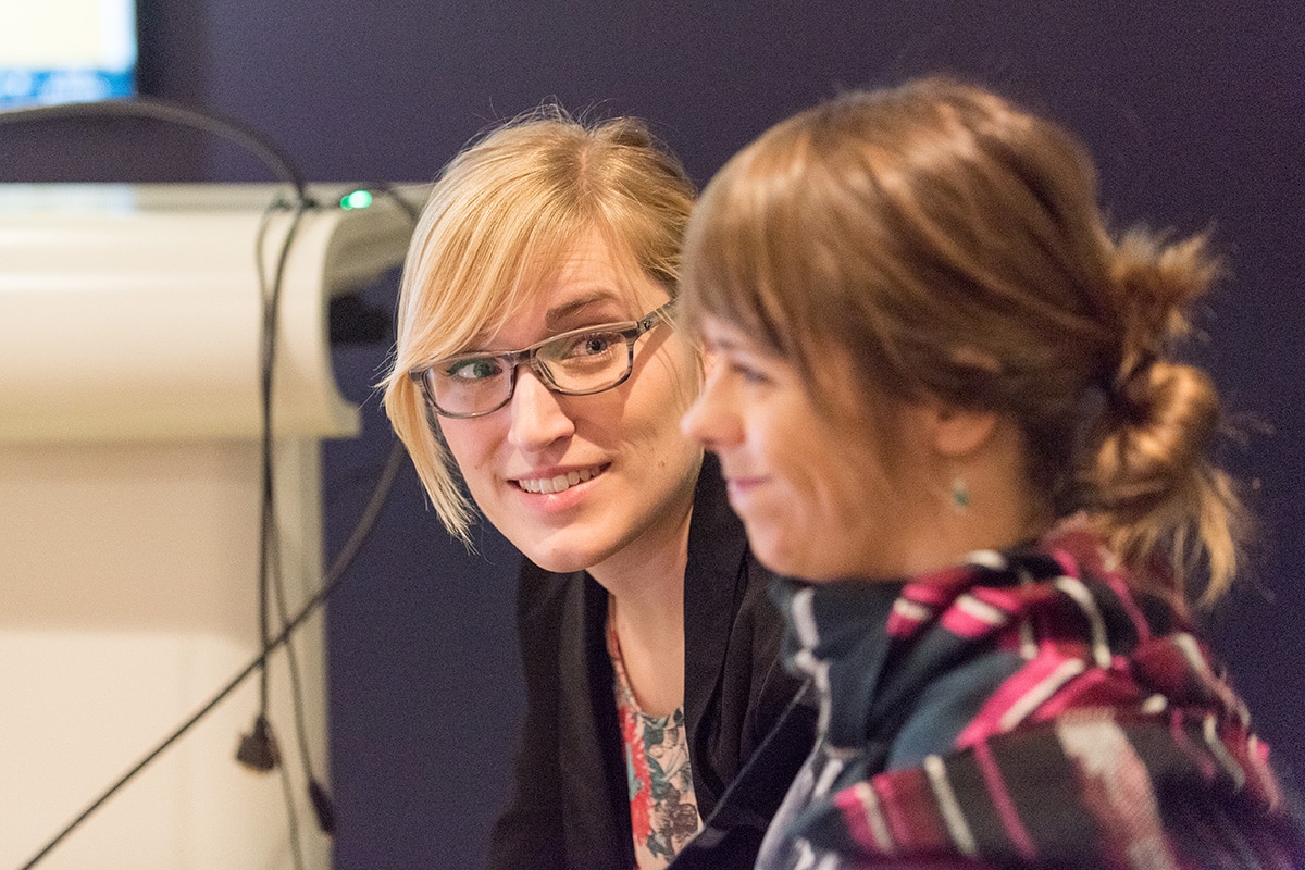Zwei Frauen mit Brille und lächelndem Gesicht, die an einer Jury-Sitzung teilnehmen, im Hintergrund ein Präsentationsger...