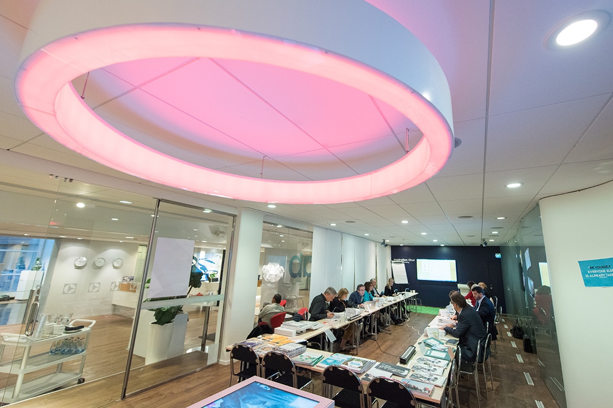 Jury-Sitzung der European Excellence Awards 2015 in Stockholm, mit einem runden, leuchtenden Deckenlicht und Tischen volle...