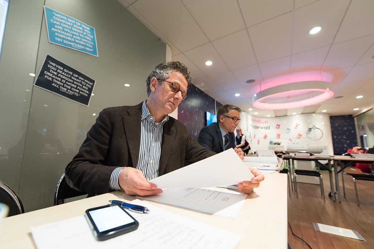 Zwei Jurymitglieder bei der Sitzung der European Excellence Awards 2015, mit Dokumenten und elektronischen Geräten am Tisch.