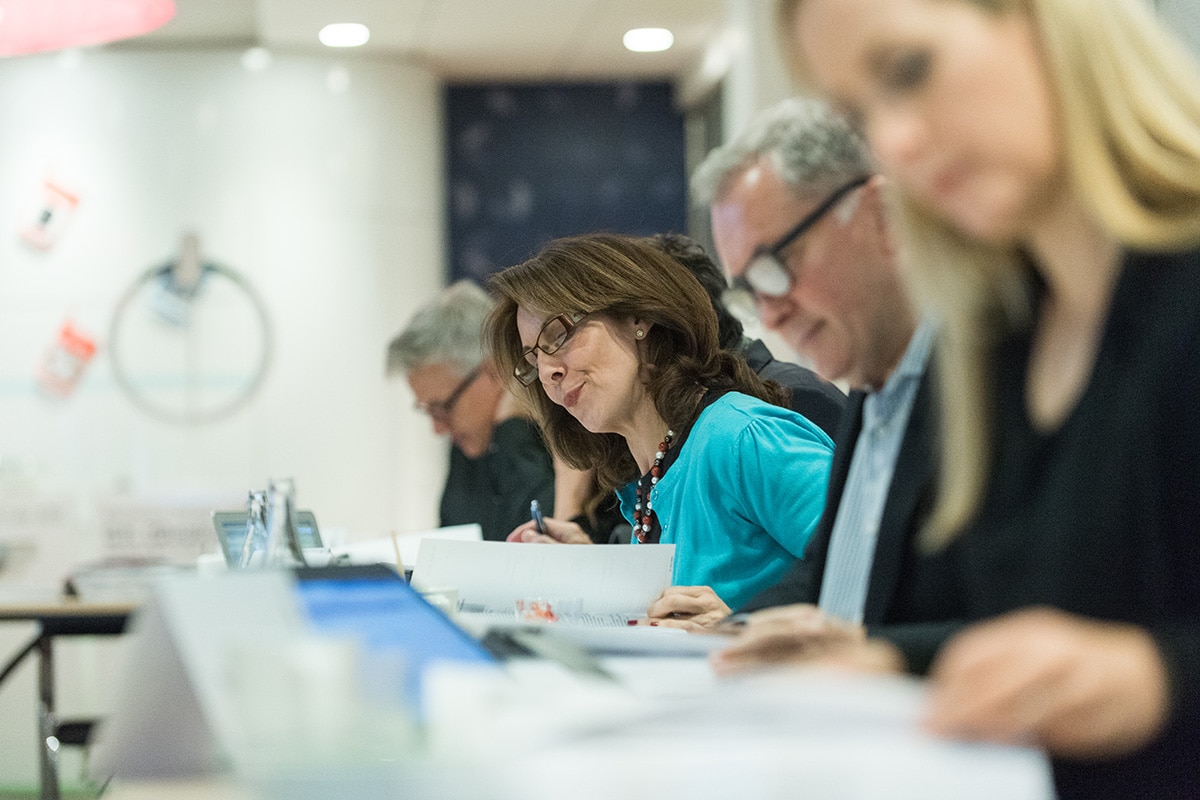 Jury-Sitzung der European Excellence Awards 2015 in Stockholm, Teilnehmer arbeiten an Tischen mit Unterlagen.