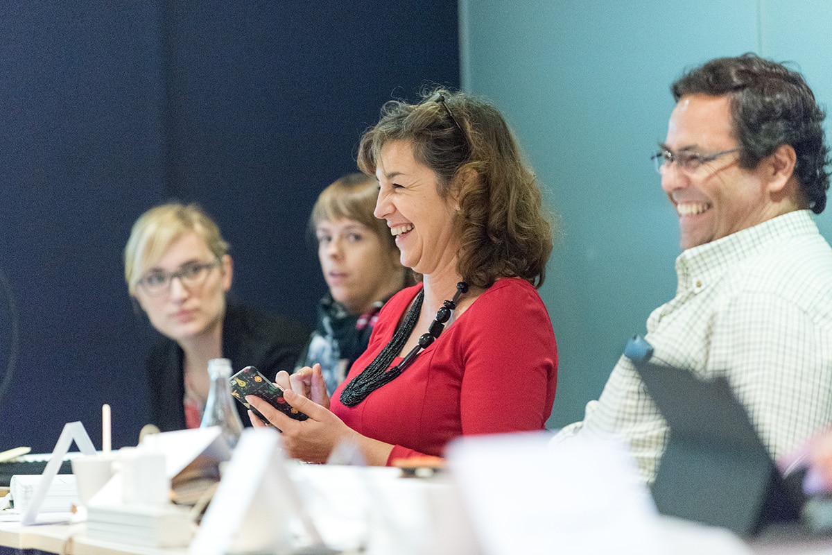 Jury-Sitzung der European Excellence Awards 2015 in Stockholm, lächelnde Teilnehmer an einem Tisch.