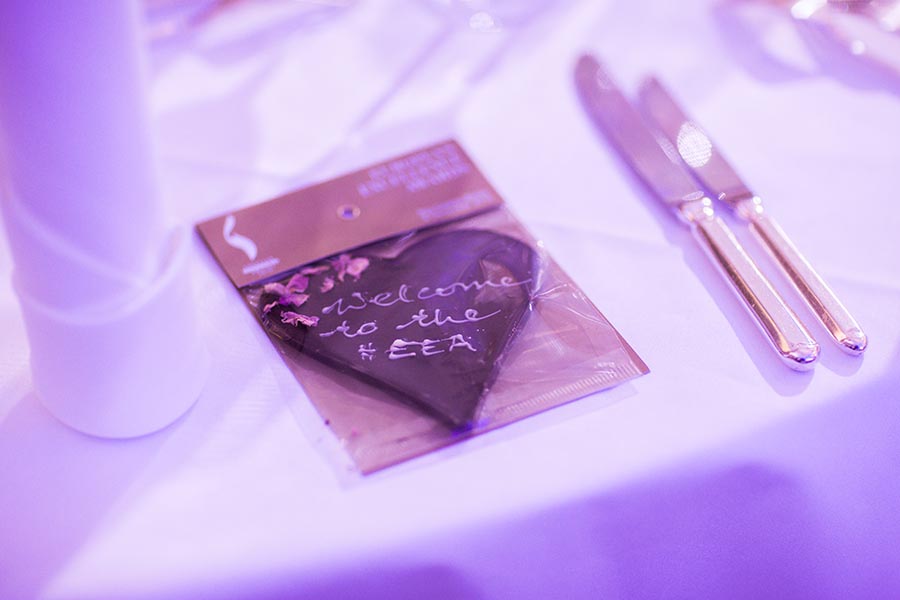 Herzförmige Schokolade mit der Aufschrift "Welcome to the EEA" auf einem Tisch mit Besteck und Tischdecke.