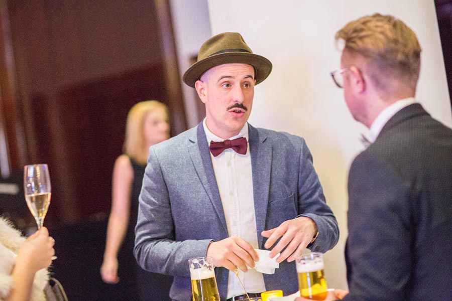 Mann mit Hut und Fliege spricht mit einem anderen Mann, beide stehen an einem Tisch mit Getränken.