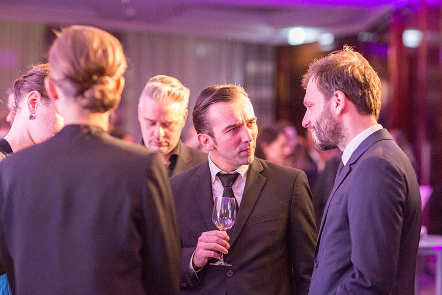 Personen in formeller Kleidung unterhalten sich bei den European Excellence Awards 2016 in Berlin.