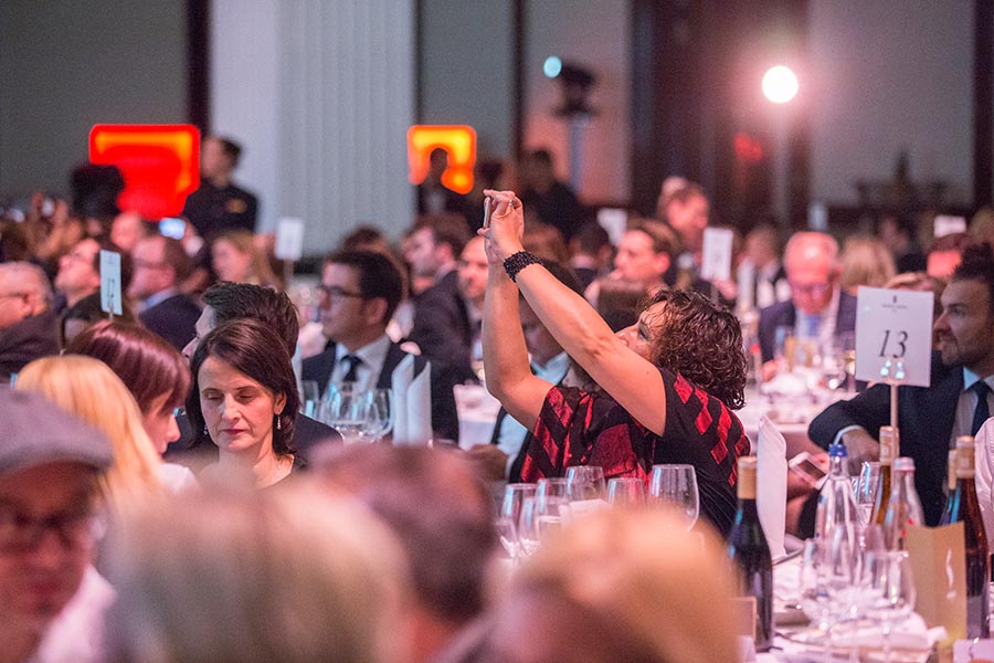 Menschenmenge bei den European Excellence Awards 2016 in Berlin, einige Gäste fotografieren, festliche Tischdekoration.