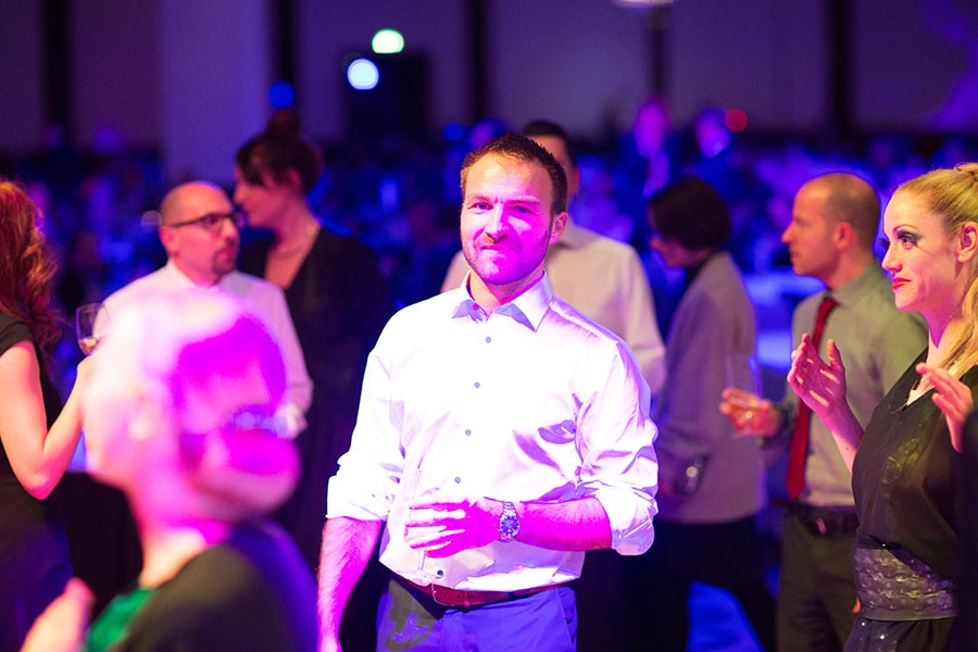 Menschen in formeller Kleidung auf einer Veranstaltung, mit bunten Lichtern und einer festlichen Atmosphäre.