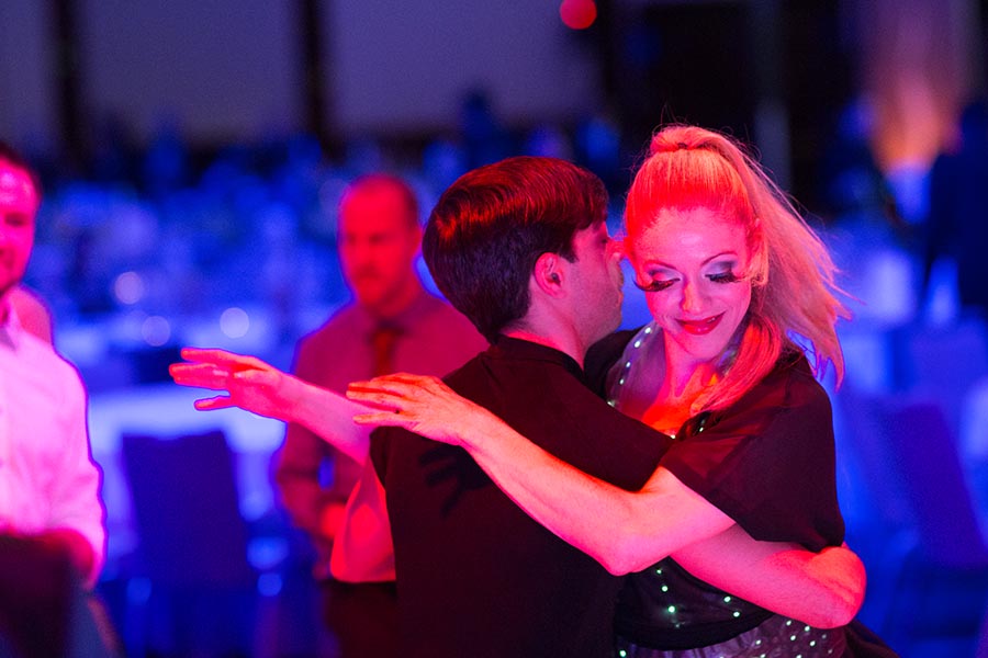 Tanzendes Paar auf einer festlichen Veranstaltung, umgeben von unscharfen Gästen und bunten Lichtern.