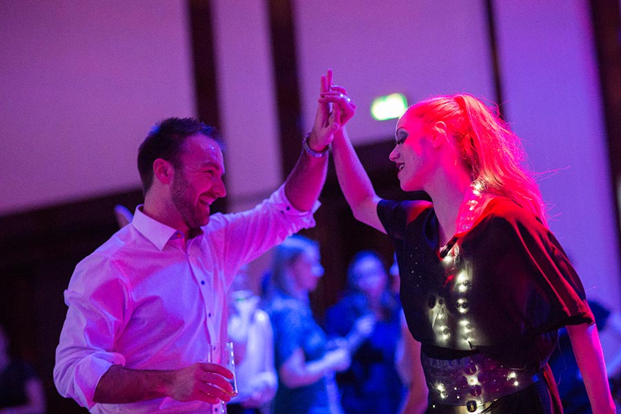 Tanzendes Paar auf einer festlichen Veranstaltung, umgeben von bunten Lichtern und fröhlicher Atmosphäre.
