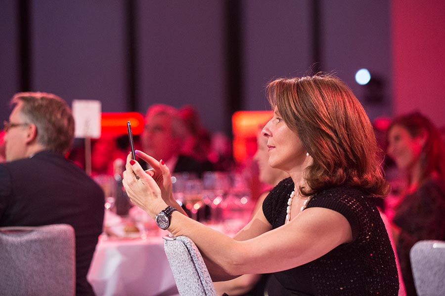 Frau mit Smartphone in eleganter Kleidung, sitzt an einem Tisch bei der European Excellence Awards Gala 2016 in Berlin.