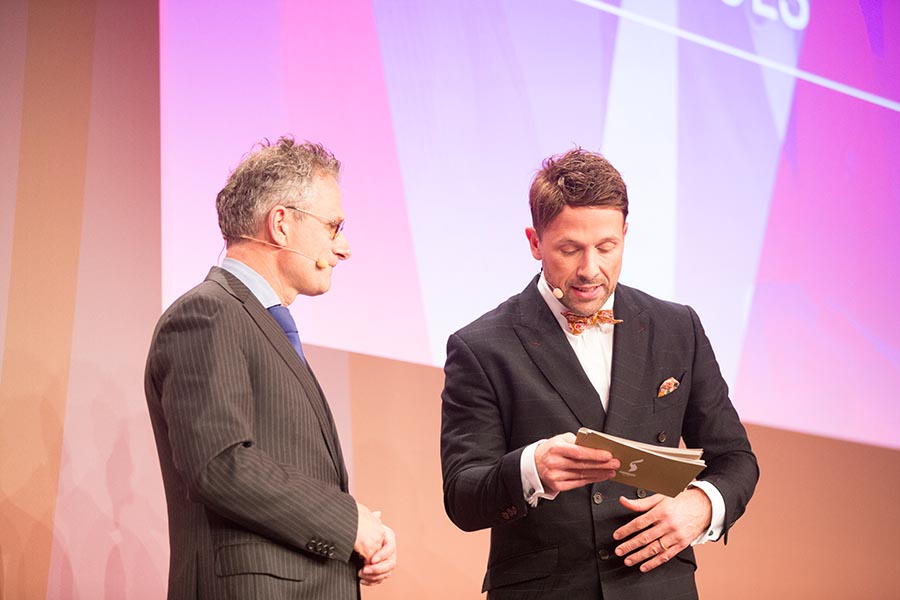 Zwei Männer auf einer Bühne bei den European Excellence Awards 2016 in Berlin, einer hält ein Dokument in der Hand.