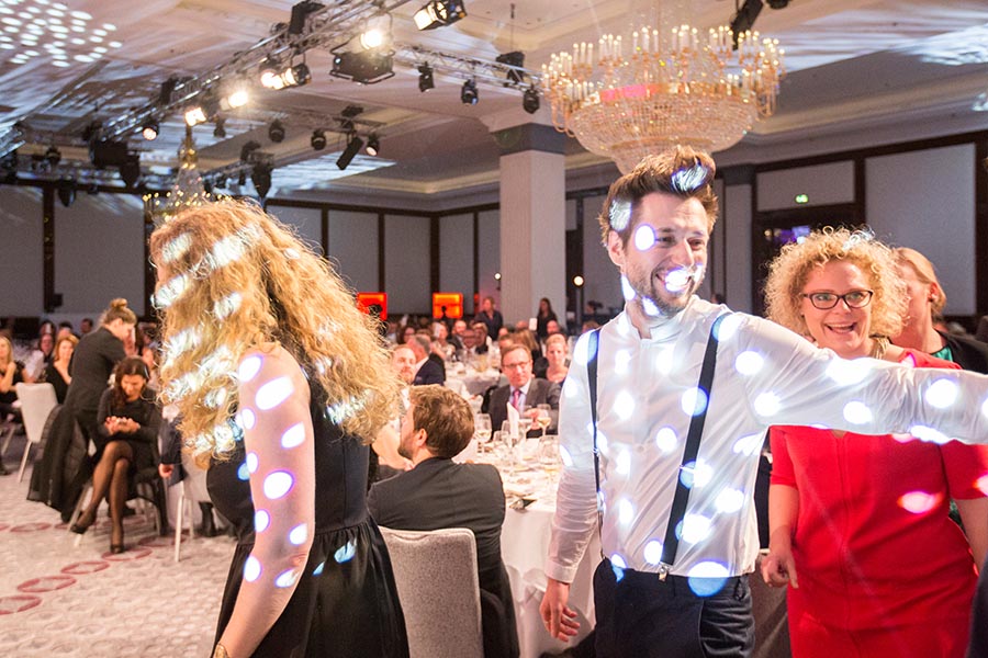 Gala-Event mit Gästen in eleganter Kleidung, Lichtern und festlicher Atmosphäre im Hintergrund.