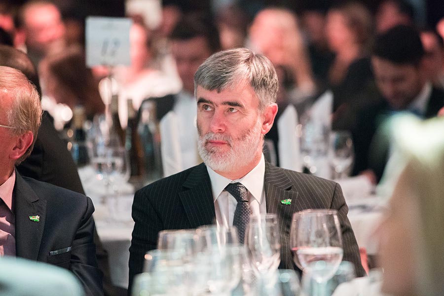 Mann mit grauen Haaren in Anzug sitzt an einem Tisch mit Gläsern und Besteck, umgeben von anderen Gästen bei einer Gala.