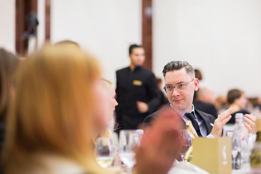 Mann in Anzug mit Brille sitzt an einem Tisch, applaudiert, während andere Gäste im Hintergrund sichtbar sind.