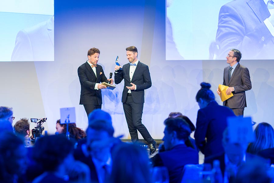 Zwei Männer auf der Bühne bei den European Excellence Awards 2016, einer hält einen Preis, Publikum im Hintergrund.