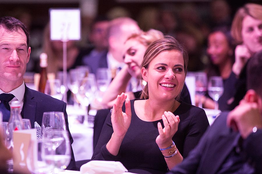 Eine Frau in schwarzem Kleid applaudiert bei einer Gala, umgeben von Gästen an festlich gedeckten Tischen.