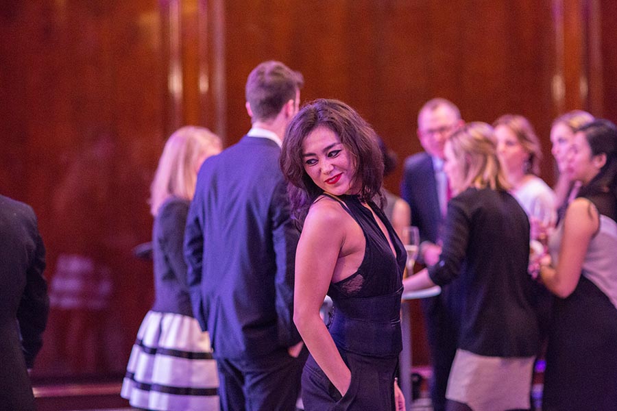Frau in schwarzem Kleid posiert lächelnd auf einer eleganten Veranstaltung mit Gästen im Hintergrund.