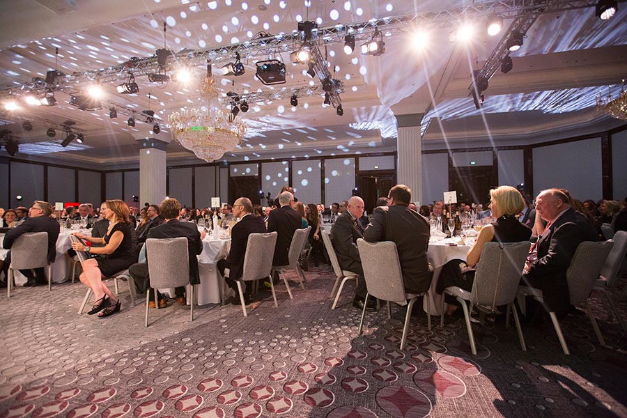 Gala-Event mit festlich gekleideten Gästen an runden Tischen, beleuchtet von Scheinwerfern und einem Kronleuchter.