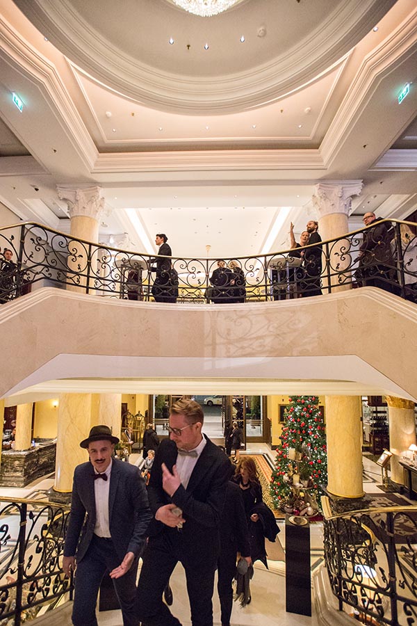 Zwei Männer in Anzügen gehen eine Treppe hinunter, umgeben von Gästen in eleganter Kleidung und festlicher Dekoration.