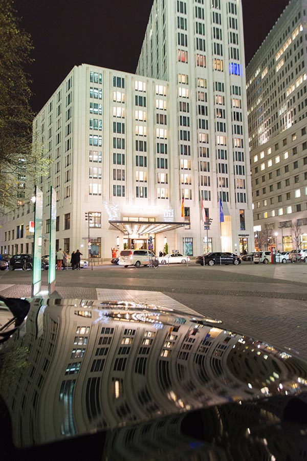 Beleuchtetes Gebäude mit Flaggen und reflektierendem Auto im Vordergrund, aufgenommen bei Nacht.