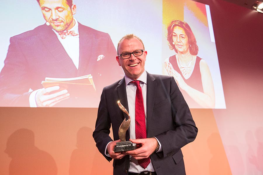 Mann in Anzug hält einen Preis, während eine Frau im Hintergrund applaudiert. Bühne mit Beleuchtung.
