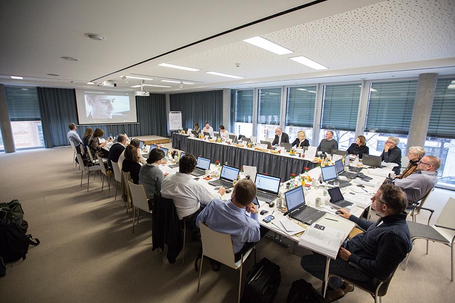Jurysitzung beim European Excellence Awards 2016 in Berlin, mit mehreren Personen an Tischen und einem Projektor im Hinter...