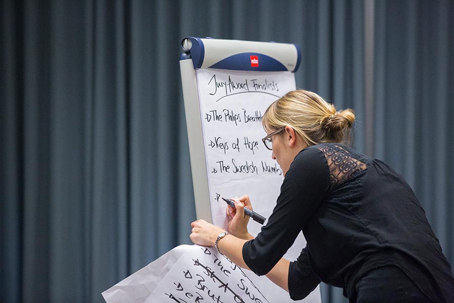 Frau schreibt auf ein Flipchart während der Jurysitzung der European Excellence Awards 2016 in Berlin.