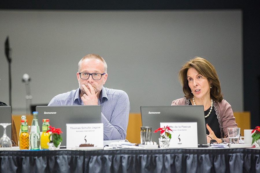 Zwei Jurymitglieder sitzen an einem Tisch mit Laptops, Getränken und Blumen, während sie an der Sitzung teilnehmen.