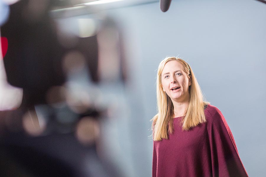 Frau mit langen blonden Haaren spricht vor einer Kamera in einem professionellen Setting.