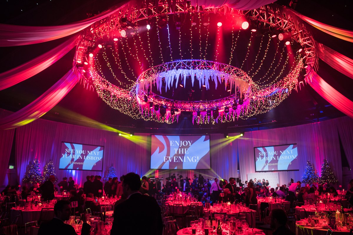 Festlich dekorierte Gala mit Lichtern, Tischen und Projektionen in einem großen Saal. Weihnachtsbaum im Hintergrund.